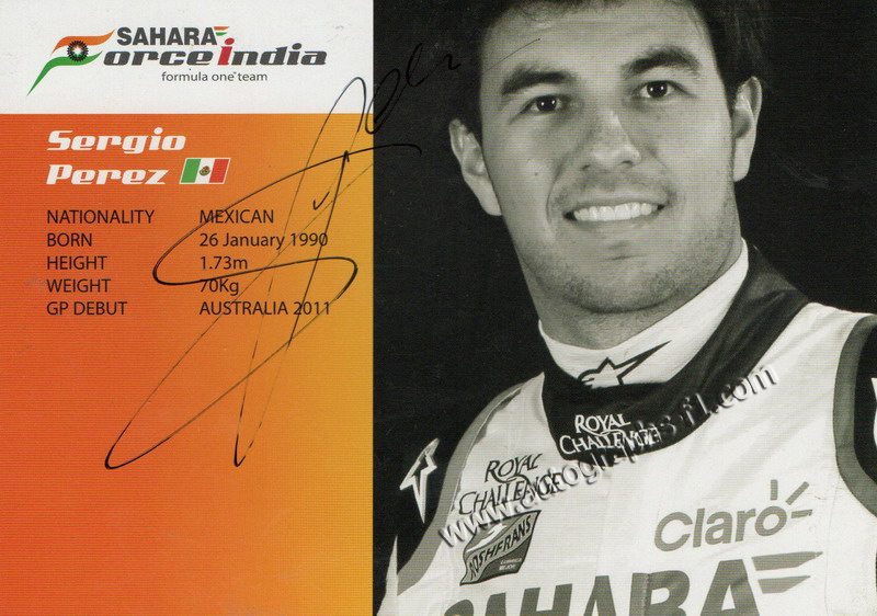 Cześć. Dziś pochodzące z wymiany autografy meksykańskiego kierowcy wyścigowego - Sergio Pereza (ur. 1990 r.). Sergio startuje w F1 od 2011 roku. W czasie 176 startów zdobył 581 punktów, 8 razy stał na podium.